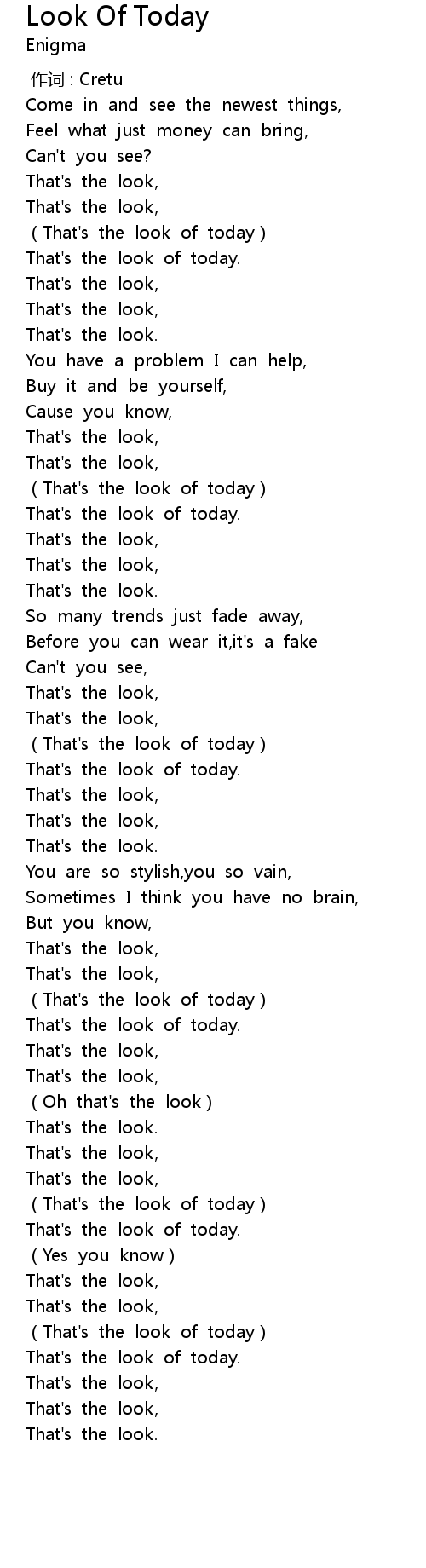 | [01:13.99] | (That's the look of today) |