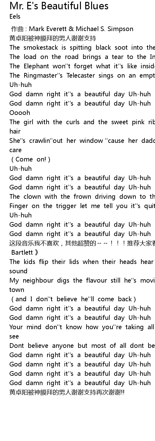 | [00:00.00] | 作曲 : Mark Everett & Michael S. Simpson |