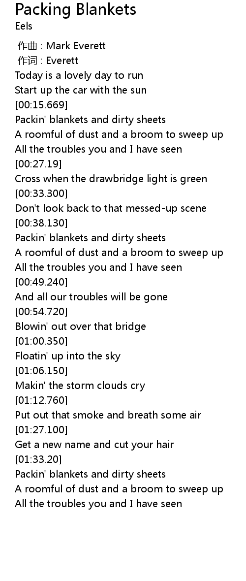 | [00:18.99] | Packin' blankets and dirty sheets |