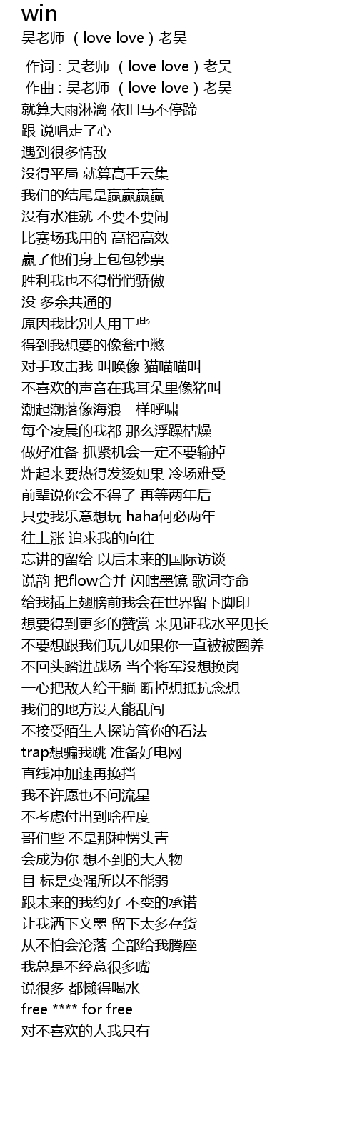| [00:00.000] | 作词 : 吴老师 (love love)老吴 |
