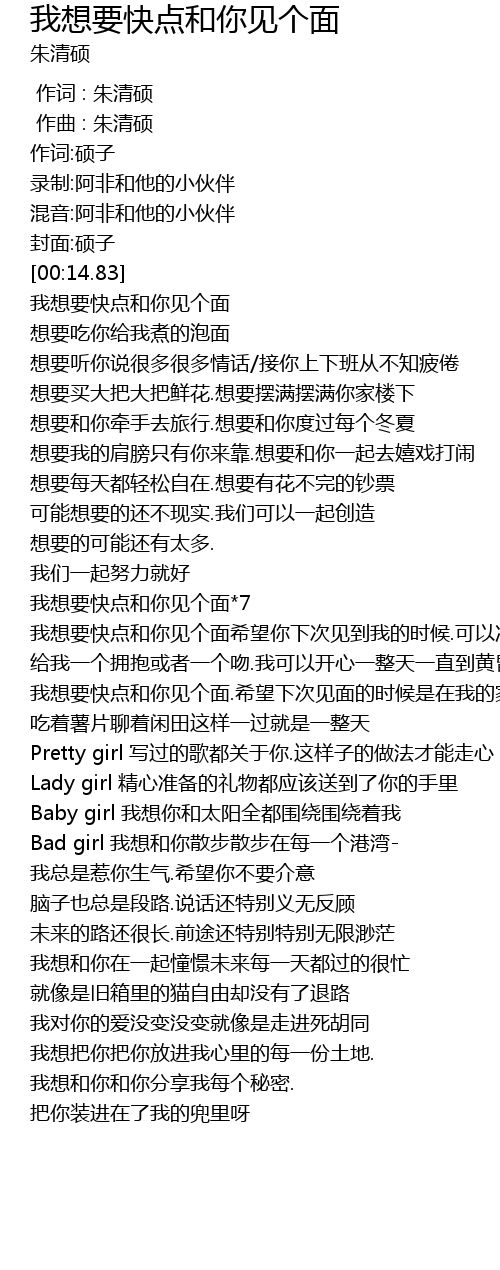 | [00:17.40] | wǒ xiǎng yào kuài diǎn hé nǐ jiàn gè miàn |