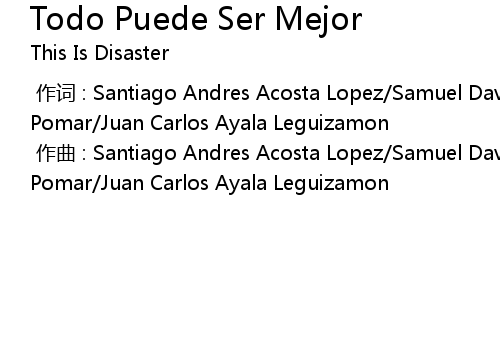 | [00:00.000] | zuo qu : Santiago Andres Acosta Lopez Samuel David Miranda Pomar Juan Carlos Ayala Leguizamon |