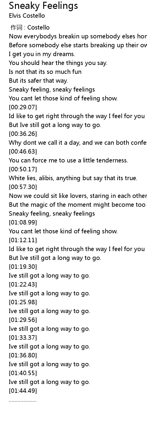 | [01:06.24] | Sneaky feeling, sneaky feelings |