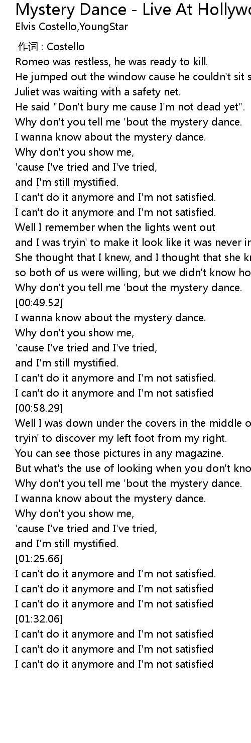 | [00:48.02] | Why don't you tell me 'bout the mystery dance. |