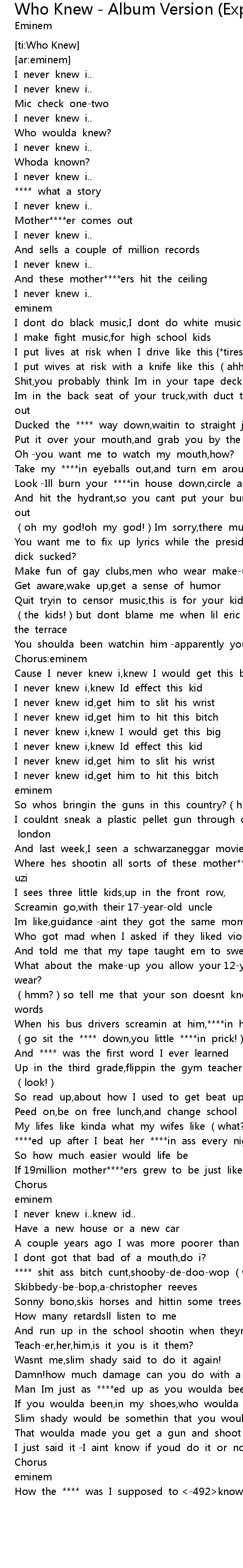 | [00:59.50] | Quit tryin to censor music,this is for your kids amusement |
