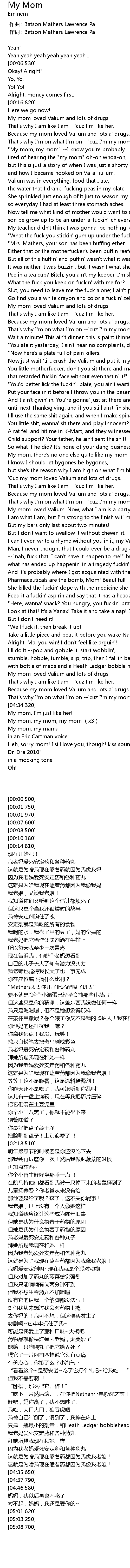 | [01:35.910] | My mom loved Valium and lots of drugs. |
