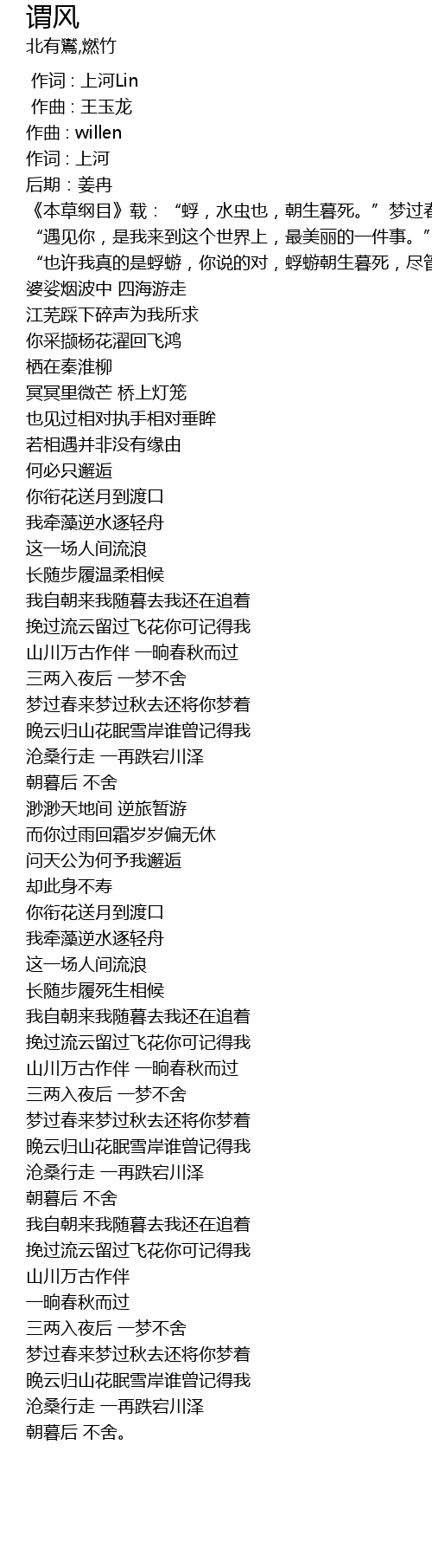 | [00:10.141] | 《本草纲目》载:“蜉,水虫也,朝生暮死。”梦过春来梦过秋去还将你梦着,可是你知道吗 “遇见你,是我来到这个世界上,最美丽的一件事。” “也许我真的是蜉蝣,你说的对,蜉蝣朝生暮死,尽管短暂,可那已经是一生了。” |