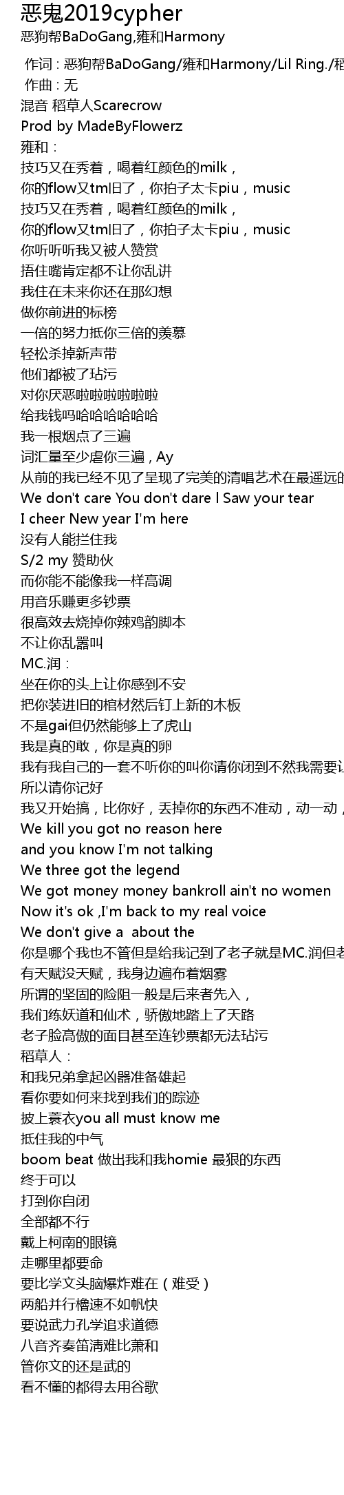 | [00:00.000] | 作词 : 恶狗帮BaDoGang/雍和Harmony/Lil Ring./稻草人 |