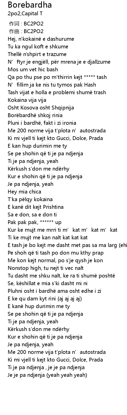 | [00:17.87] | Hej, n' kokain e dashurume |