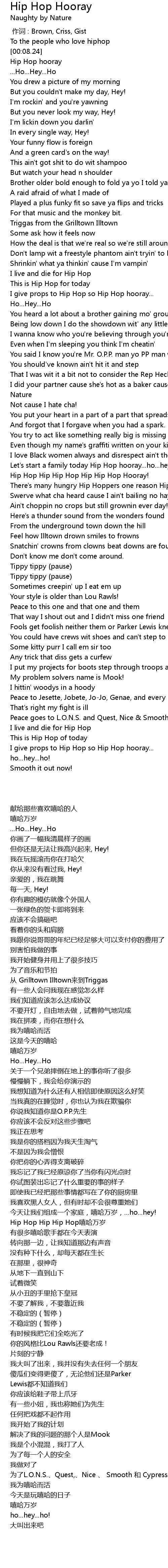 | [03:14.97] | I give props to Hip Hop so Hip Hop hooray... |