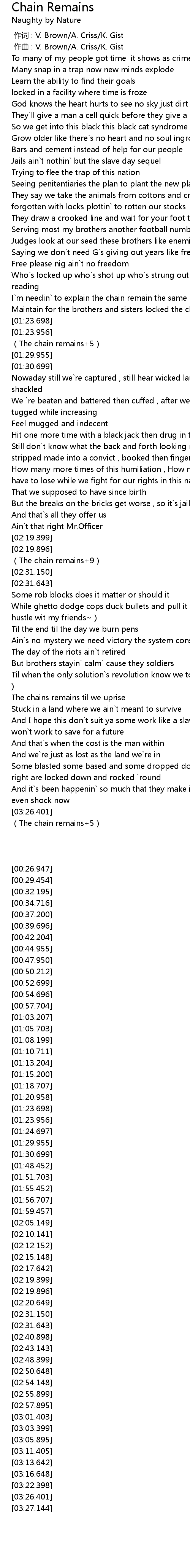 | [01:48.452] | Nowaday still we re captured , still hear wicked laughter while shackled |