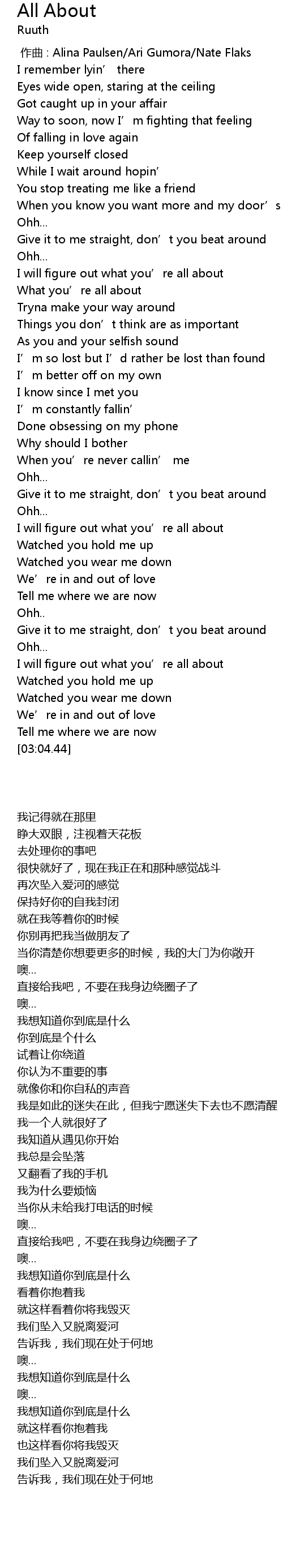 | [00:35.56] | Give it to me straight, don’t you beat around |