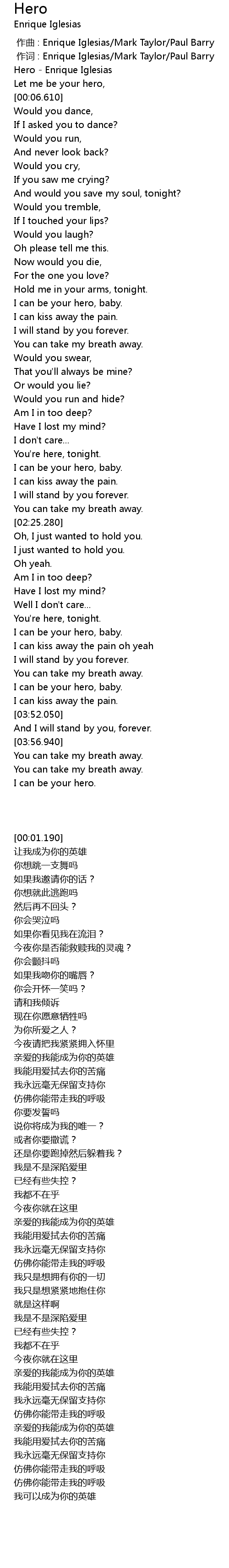 | [00:01.190] | Hero - Enrique Iglesias |