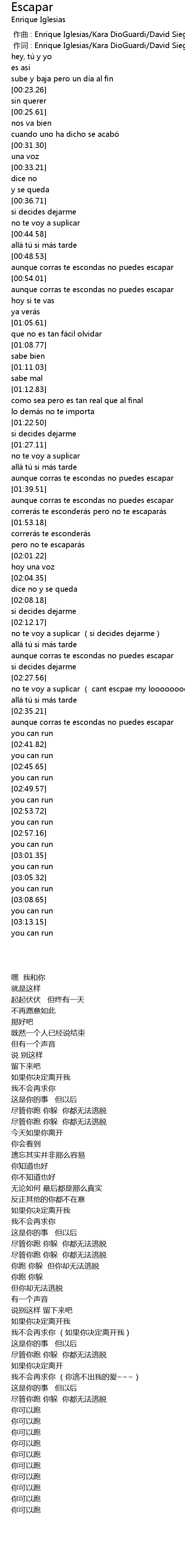 | [00:01.00] | 作词 : Enrique Iglesias/Kara DioGuardi/David Siegel/Steve Morales |