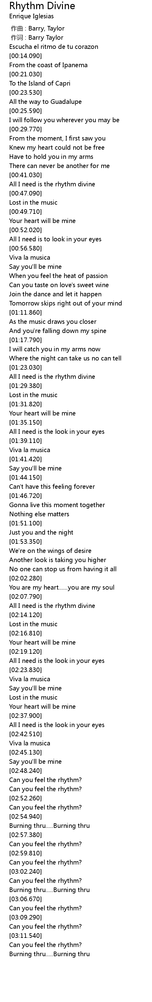 | [02:10.180] | All I need is the rhythm divine |