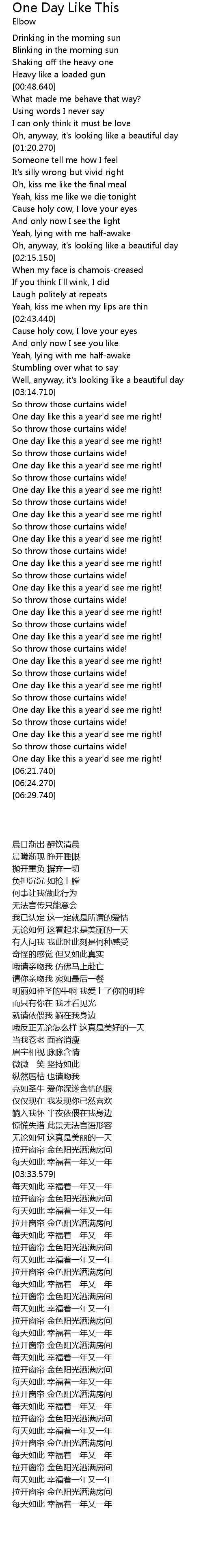 | [01:08.550] | Oh, anyway, it' s looking like a beautiful day |