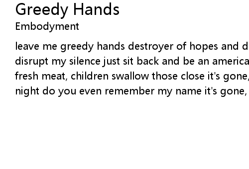 | leave me greedy hands destroyer of hopes and dreams young judas, fall away disrupt my silence just sit back and be an american it's gone, my innocence fresh meat, children swallow those close it's gone, my innocence thief in the night do you even remember my name it's gone, my innocence |
