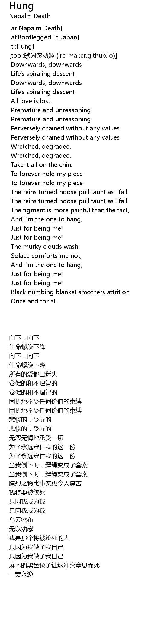 | [01:48.843] | The reins turned noose pull taunt as i fall. |