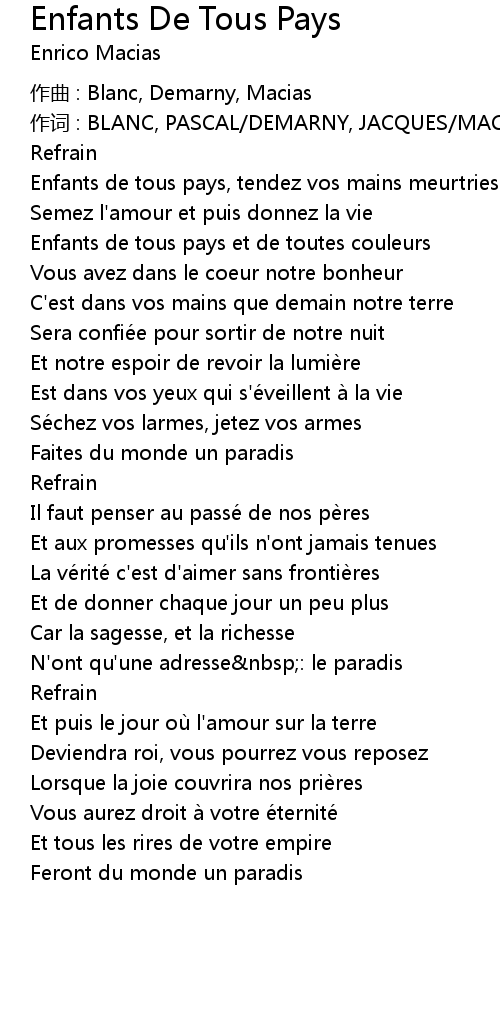| 作词 : BLANC, PASCAL/DEMARNY, JACQUES/MACIAS, ENRICO | |