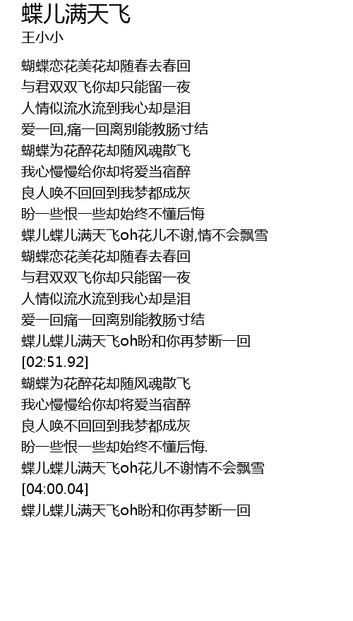 | [03:46.35] | 蝶儿蝶儿满天飞oh花儿不谢情不会飘雪 |