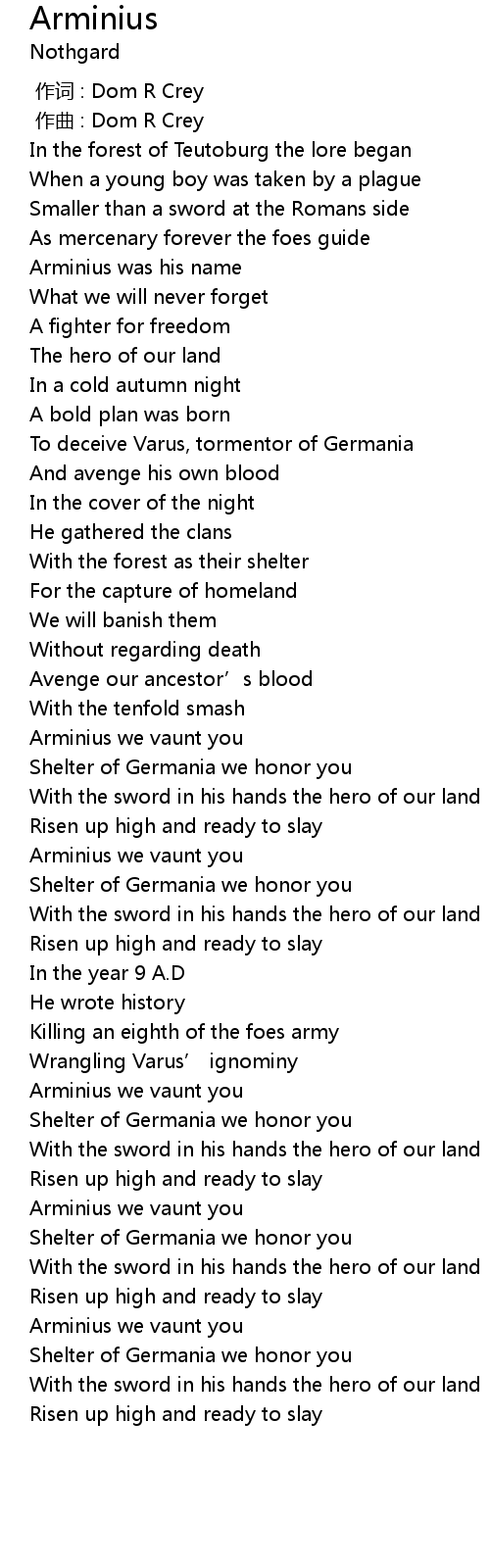 | [00:38.800] | In the forest of Teutoburg the lore began |