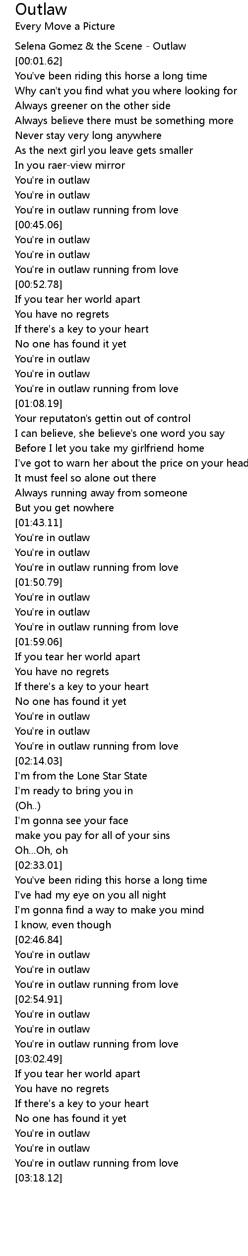 | [00:00.00] | Selena Gomez & the Scene - Outlaw |