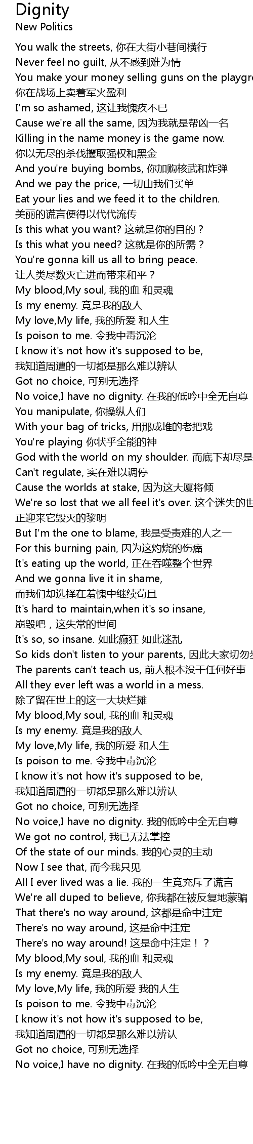 | [00:44.600] | No voice, I have no dignity. zài wǒ de dī yín zhōng quán wú zì zūn |