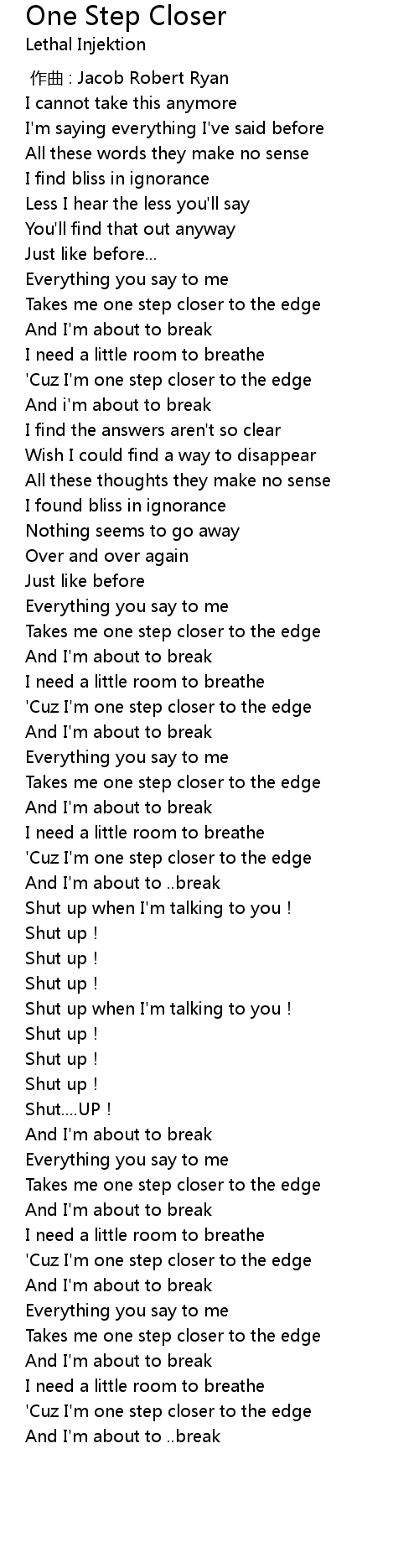 | [01:35] | ' Cuz I' m one step closer to the edge |