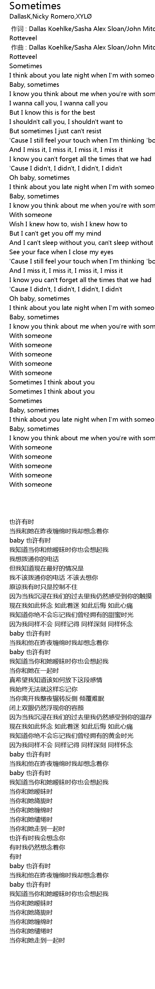 | [00:00.659] | zuo qu : Dallas Koehlke Sasha Alex Sloan John Mitchell Nick Rotteveel |