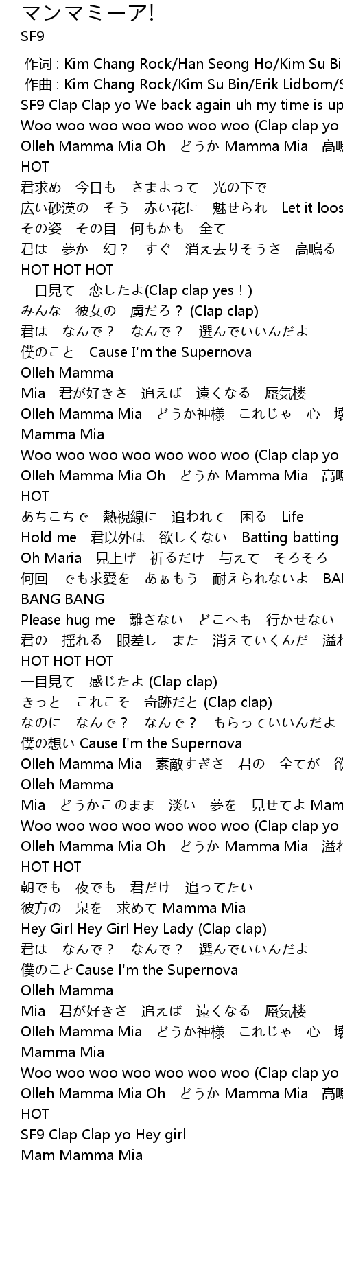 | [02:19.173] | Olleh Mamma Mia Oh どうか Mamma Mia 溢れる 想いは HOT HOT HOT |