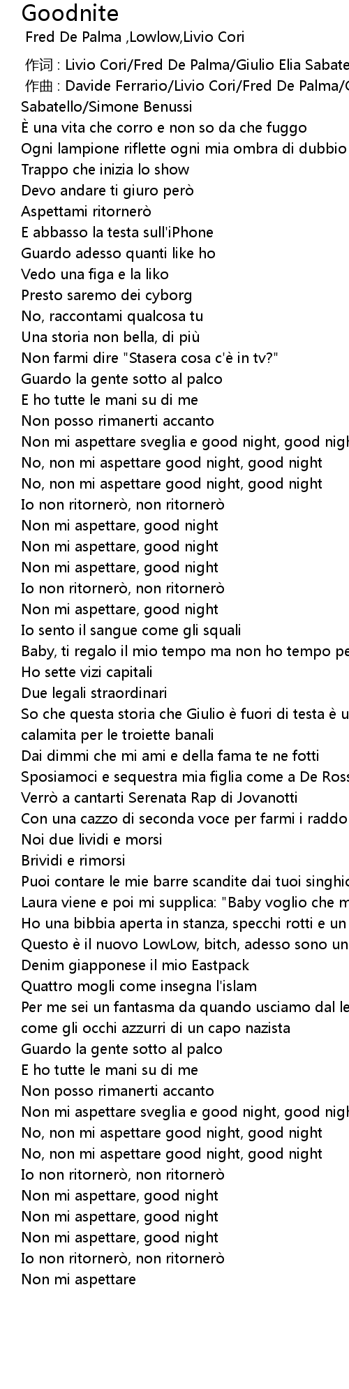 | [02:43.200] | Non mi aspettare sveglia e good night, good night |