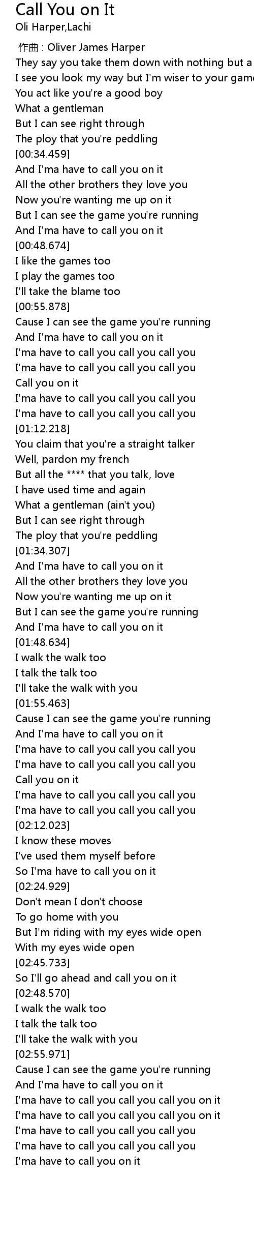| [03:00.517] | I'ma have to call you call you call you on it |