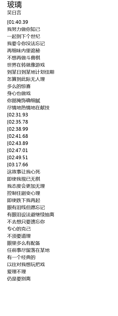 | [00:20.00][01:40.39][03:23.35] | 吴日言-玻璃(粤) |