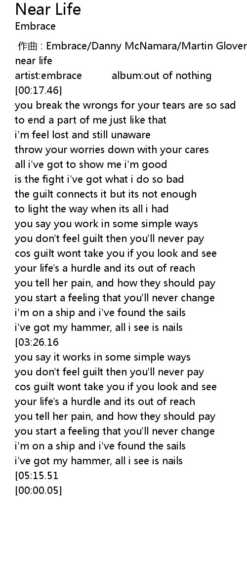 | [00:00.00] | 作曲 : Embrace/Danny McNamara/Martin Glover |