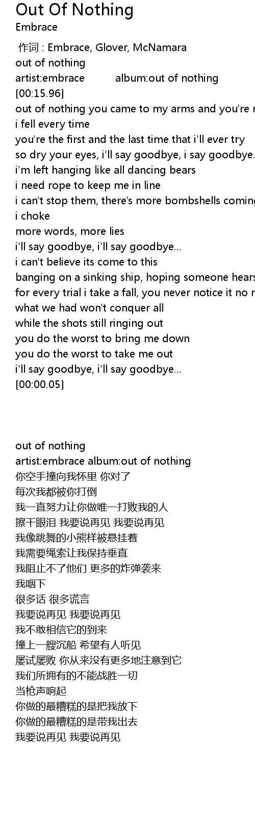 | [00:11.57] | artist: embrace album: out of nothing |