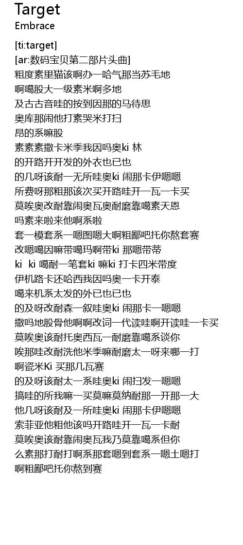 | [03:09.411] | 的及呀该耐太一系哇奥ki 闹扫发一嗯嗯 |