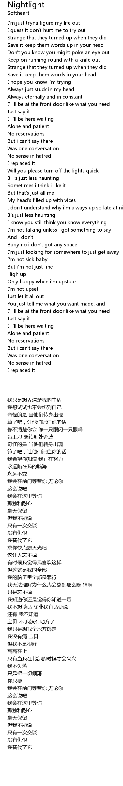 | [01:22.96] | I don't understand why i'm always up so late at night, guess |