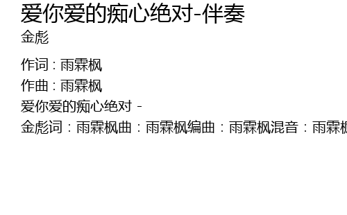 | 爱你爱的痴心绝对 - 金彪词:雨霖枫曲:雨霖枫编曲:雨霖枫混音:雨霖枫发行:安雨琪枫文化传媒出品:雨世霖枫国际文化传播有限公司曾经我最爱的人你现在过的好吗自从分手了以后我不知道在去爱谁我曾经最爱的人却将我伤的太深我的心好疼好痛为何你的心会是那么冷我爱你爱的痴心绝对一生甘心为你伤悲不想计较那些所谓谁对谁错也不必追问爱你到底犯了什么罪那些过错让我来背为什么这最真的情却碰不到最真的心曾经我最爱的人你现在过的好吗自从分手了以后我不知道在去爱谁我曾经最爱的人却将我伤的太深我的心好疼好痛为何你的心会是那么冷我爱你爱的痴心绝对一生甘心为你伤悲不想计较那些所谓谁对谁错也不必追问爱你到底犯了什么罪那些过错让我来背为什么这最真的情却碰不到最真的心我爱你爱的痴心绝对一生甘心为你伤悲不想计较那些所谓谁对谁错也不必追问爱你到底犯了什么罪那些过错让我来背为什么这最真的情却碰不到最真的心 |