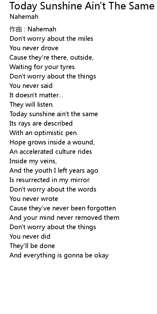 | Today sunshine ain' t the same | |
