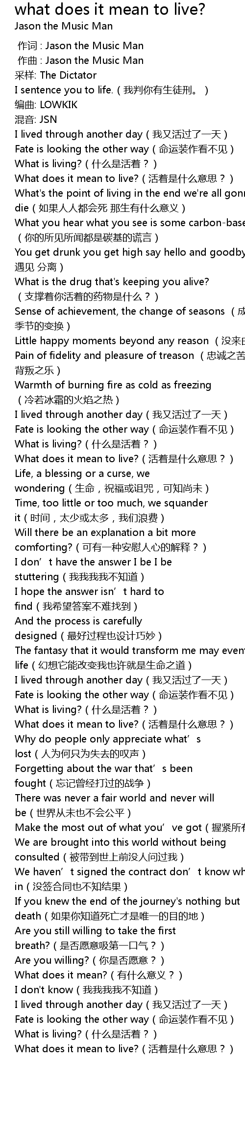 | [00:34.134] | What does it mean to live? huo zhe shi shen me yi si? |