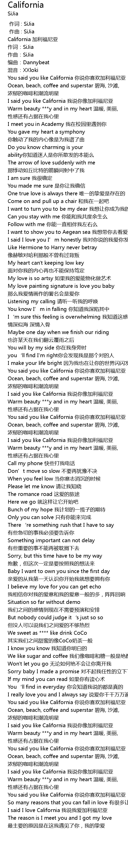 | [00:15.937] | You said you like California nǐ shuō nǐ xǐ huān jiā lì fú ní yà |