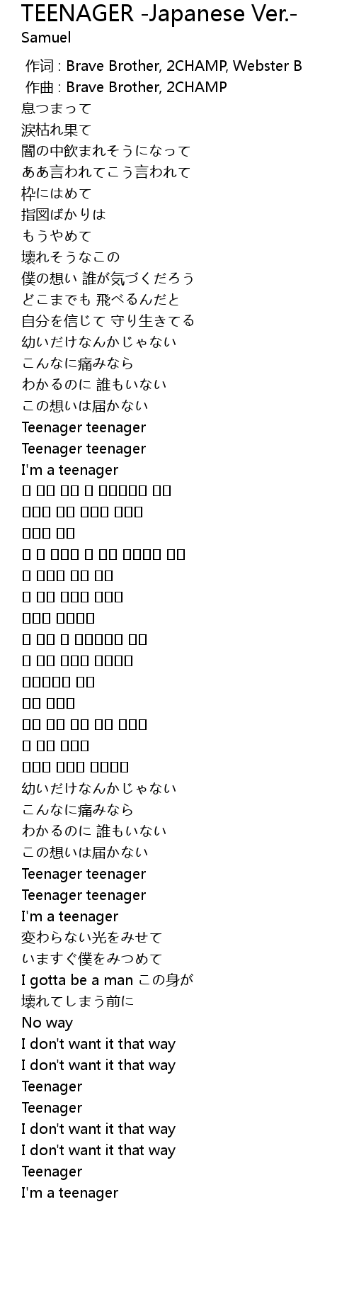 | [00:00.000] | 作词 : Brave Brother, 2CHAMP, Webster B |