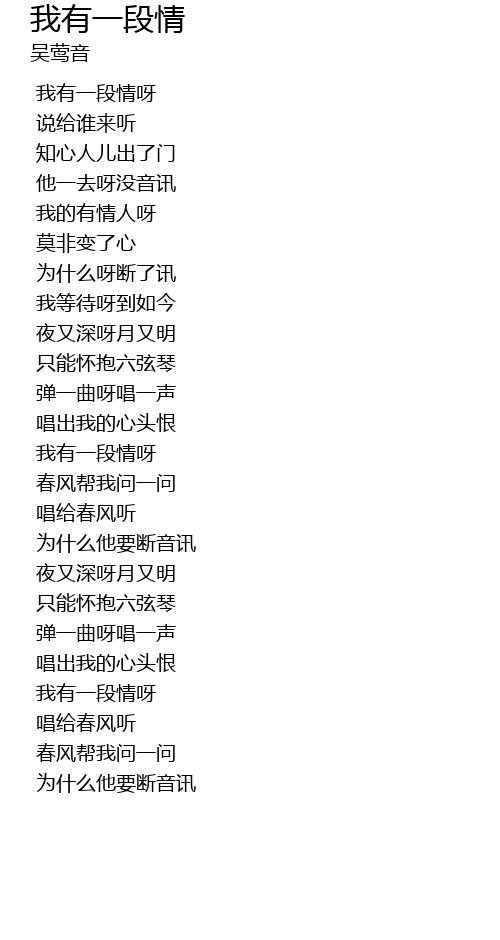 | [00:13.930] | wǒ yǒu yī duàn qíng ya |