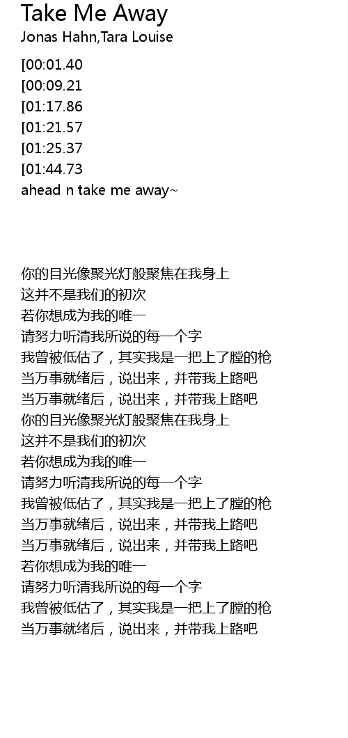 | [02:15.25][01:44.73][01:29.22][00:27.75][00:43.22] | If you're ready, say it, go ahead n take me away~ |