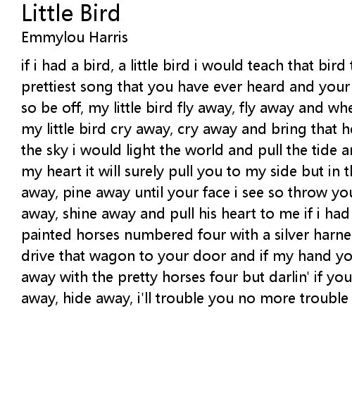 if i had a bird, a little bird i would teach that bird to sing your name prettiest song that you have ever heard and your indifferent heart i will claim so be off, my little bird fly away, fly away and when my love you see only then, my little bird cry away, cry away and bring that heart to me if i had a moon in the sky i would light the world and pull the tide and when the moon is full like my heart it will surely pull you to my side but in the darkest night i pine pine away, pine away until your face i see so throw your light my lovely moon shine away, shine away and pull his heart to me if i had a wagon made of gold pretty painted horses numbered four with a silver harness i would hitch them up and drive that wagon to your door and if my hand you choose to hold ride away, ride away with the pretty horses four but darlin' if you heart's still cold hide away, hide away, i'll trouble you no more trouble you no more |