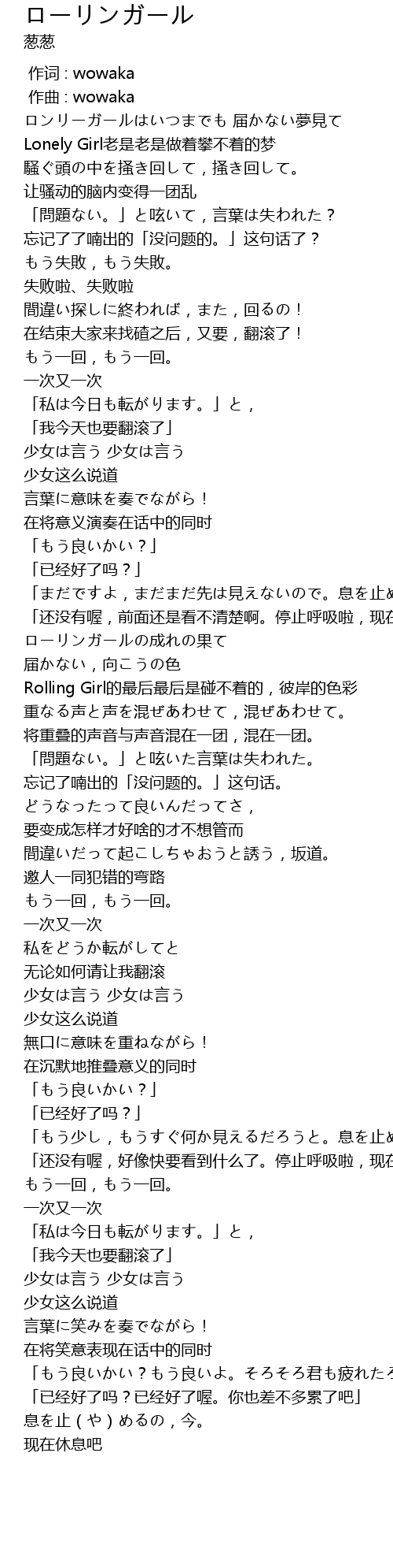 | [01:49.064] | Rolling Girl的最后最后是碰不着的,彼岸的色彩 |