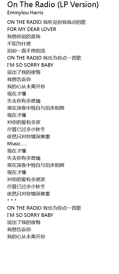 | [00:13.53] | ON THE RADIO 我听见你我我点的歌 |