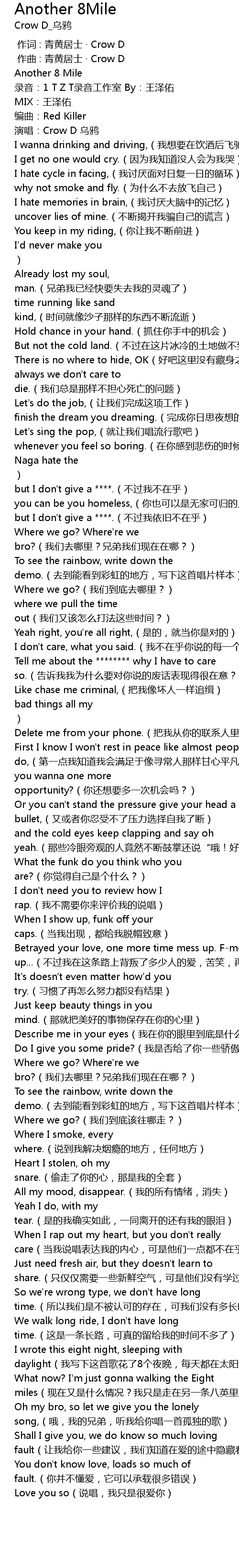 | [02:54.027] | What now? I' m just gonna walking the Eight miles xiàn zài yòu shì shén me qíng kuàng? wǒ zhǐ shì zǒu zài lìng yī tiáo bā yīng lǐ ér yǐ |