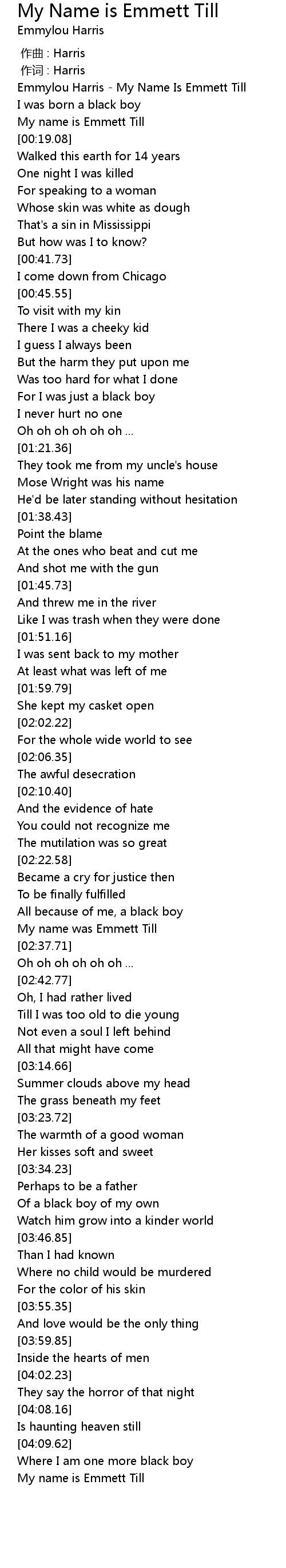 | [00:05.49] | Emmylou Harris My Name Is Emmett Till |