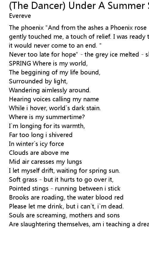 The phoenix "And from the ashes a Phoenix rose - with wings made of gold it gently touched me, a touch of relief. I was ready to start a new circle, hoping it would never come to an end. "